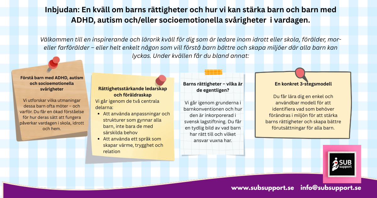 Vi går igenom vanliga utmaningar, varför de uppstår och hur barnens sätt att fungera påverkar vardagen i skola, idrott och hem. Du får konkreta exempel som gör det lättare att se bakom beteenden och förstå vad barnet egentligen signalerar.